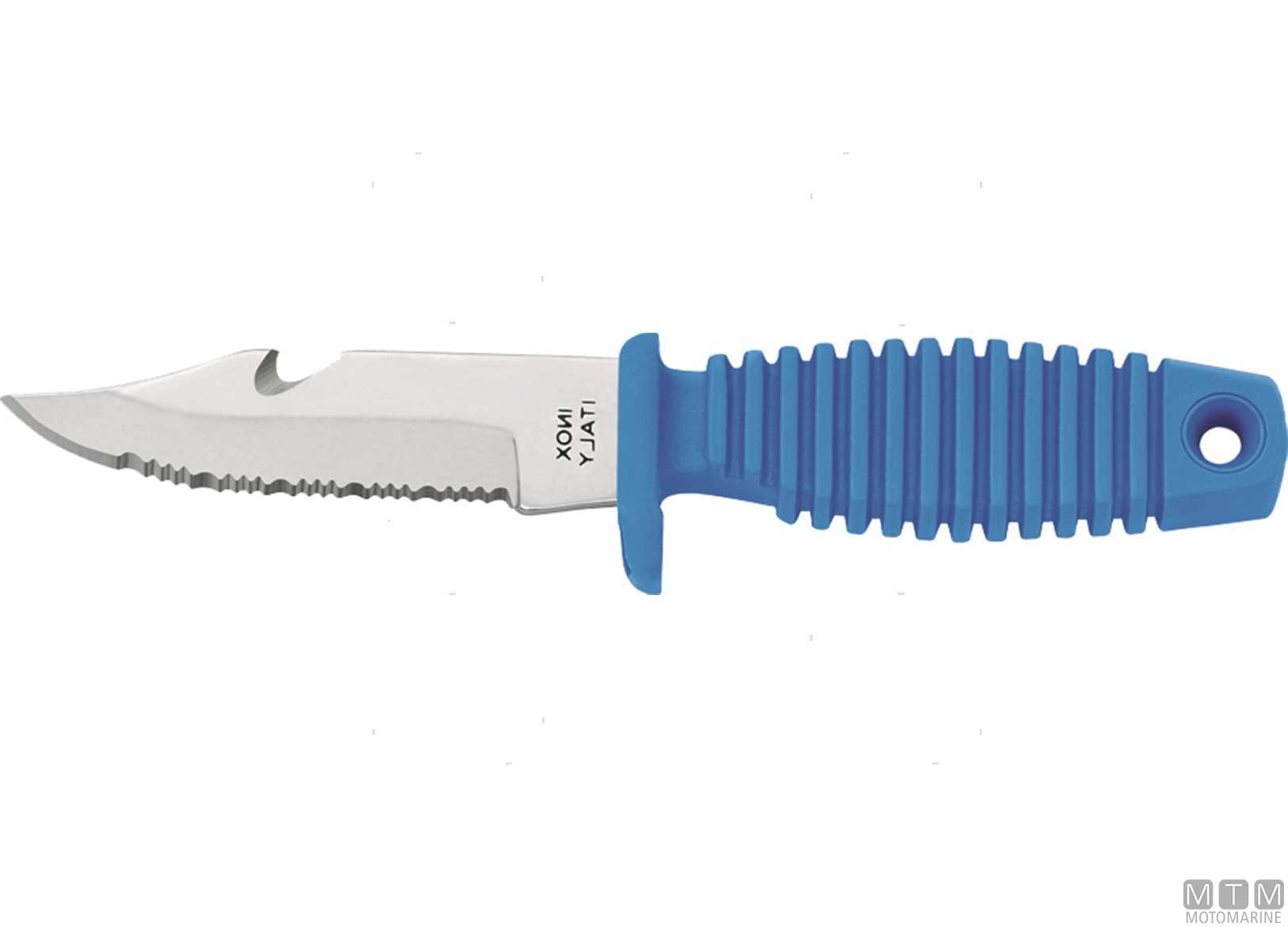 Coltello Sub compatto con tagliacima, fodero e cinghie. Lama in Acciaio Inossidabile W1.4028. Dopo l'uso lavare la lama con acqua dolce e ingrassarla.