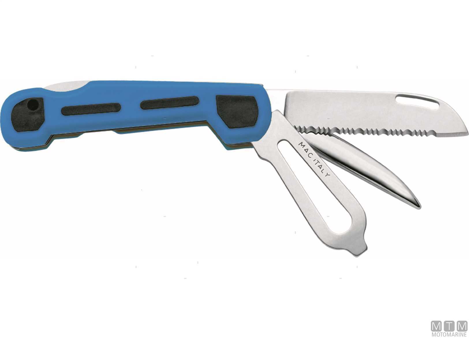 Coltello a serramanico con bloccalama. Completo di gira-grilli, apribottiglia, cacciavite a taglio e cavigliera aprinodi. Manico in PP e TPE, lama in Acciaio Inossidabile W1.4419.