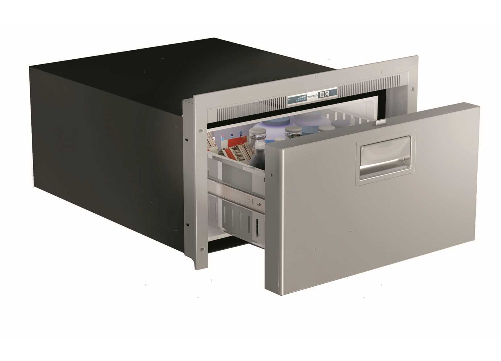 Congelatore a cassetto con struttura esterna in Acciaio Inox. Compressore esterno 12/24V, consumo 40W. Completo con profilo a scorrimento per installazione porta standard oppure a filo.↵H = Altezza ↵W = Larghezza ↵L = Lunghezza