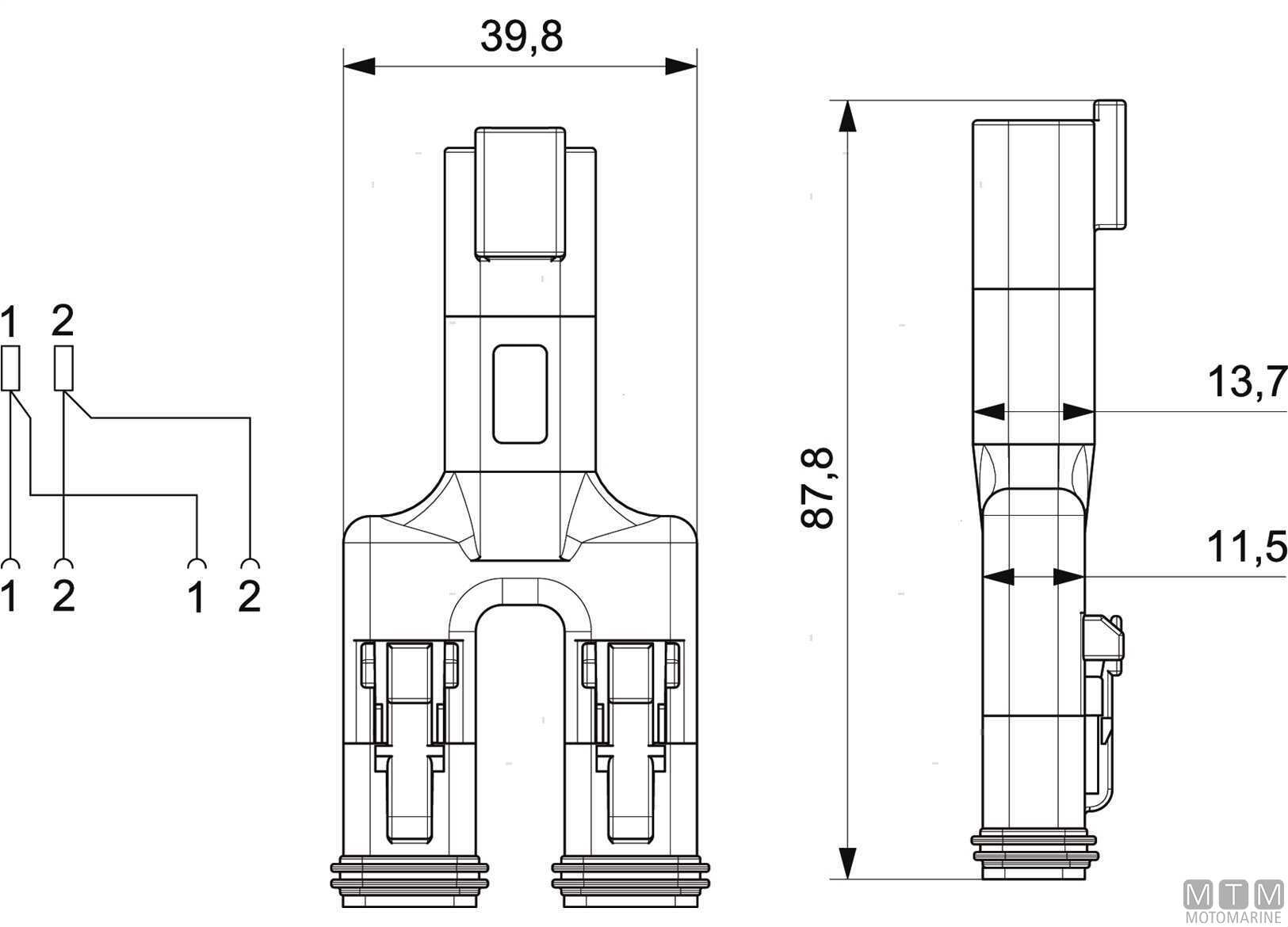 Connettore ad innesto snap-lock splitter a Y sigillato IP69K progettato per applicazioni elettriche marine in continua e alternata. Voltaggio 0-230V, max 14A, dimensioni 40x88 mm.