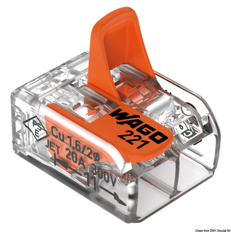 Sono ideati per collegare conduttori rigidi, semi-rigidi e flessibili e sono facili da applicare: basta alzare la leva, inserire il conduttore e abbassare la leva. I morsetti WAGO® garantiscono un impianto elettrico più veloce e un’installazione più sicura. I supporti di montaggio permettono l'installazione dei morsetti di giunzione serie 221 (2, 3 e 5 poli) sia in orizzontale che in verticale, il supporto si può fissare in modo semplice, direttamente sulla guida DIN oppure con viti per montaggio diretto. I conduttori possono essere comodamente collegati sia prima che dopo il montaggio dei morsetti nel supporto di fissaggio. Max temperatura ambiente 85°C.