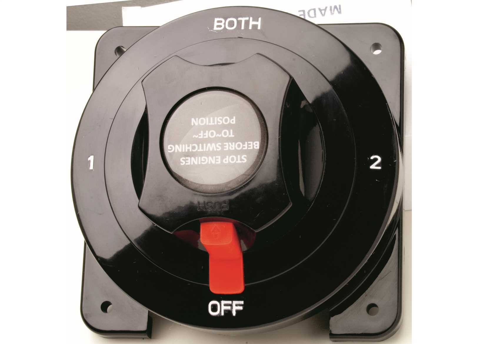 Deviatore staccabatterie a quattro posizioni. Permette di staccare il circuito, di selezionare una delle due batterie oppure entrambe in contemporanea.↵Dim: 133 x 133 mm x H75 mm.