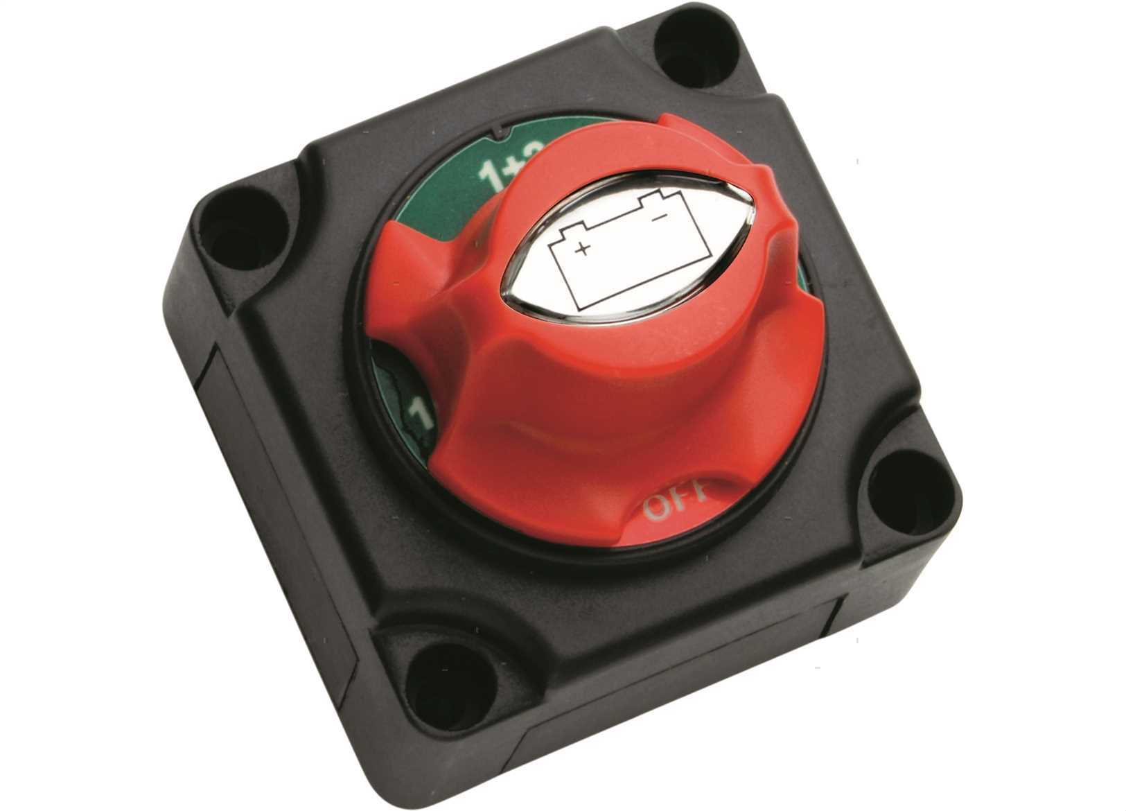 Deviatore staccabatterie compatto a quattro posizioni. Permette di staccare il circuito, di selezionare una delle due batterie oppure entrambe in contemporanea. Montaggio a parete o a incasso.