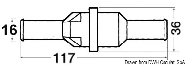 Lascia passare solo l’aria e blocca il carburante quando arriva, per cui elimina le striature di carburante sulla fiancata della barca. Quando il carburante é in prossimità di tale dispositivo cessa il sibilo del passaggio aria e ciò indica che il serbatoio è pieno.