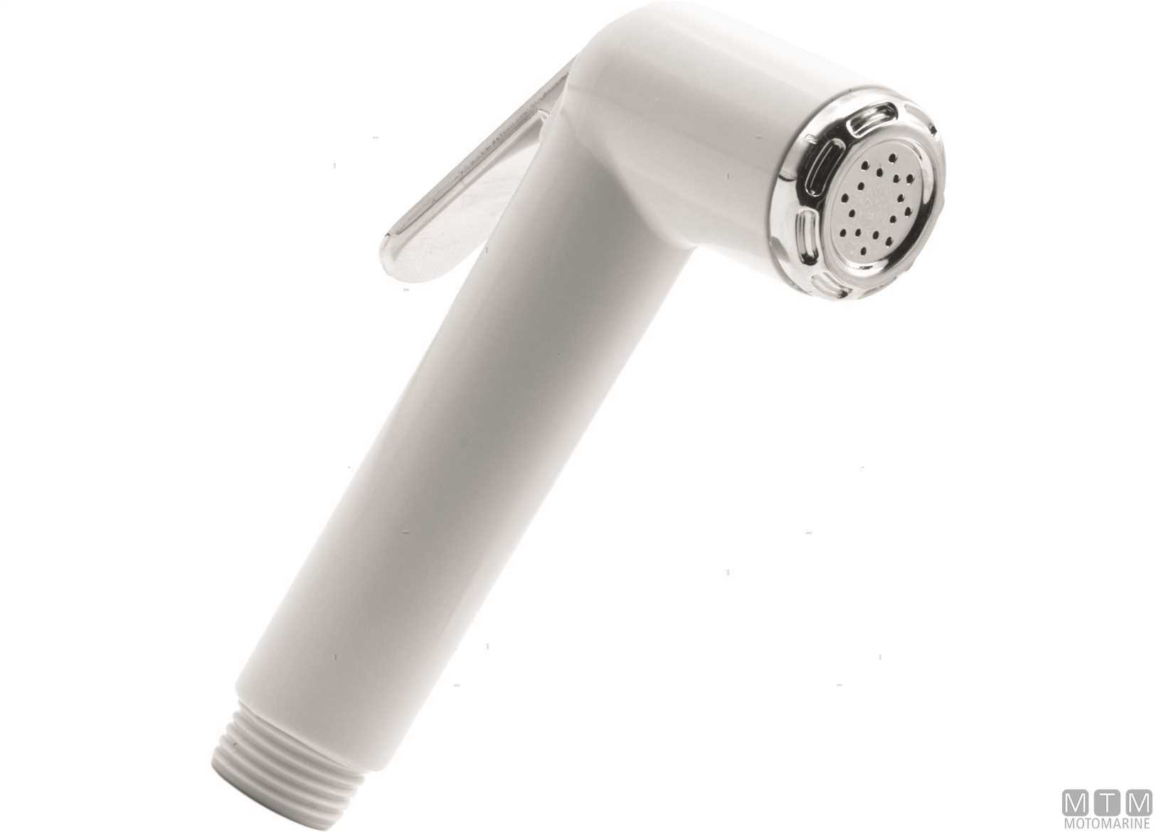 Testa doccetta Jara in ABS bianco antiurto con levetta e spray cromati.Leva comando apri/chiudi e getto continuo. Attacco da 1/2".