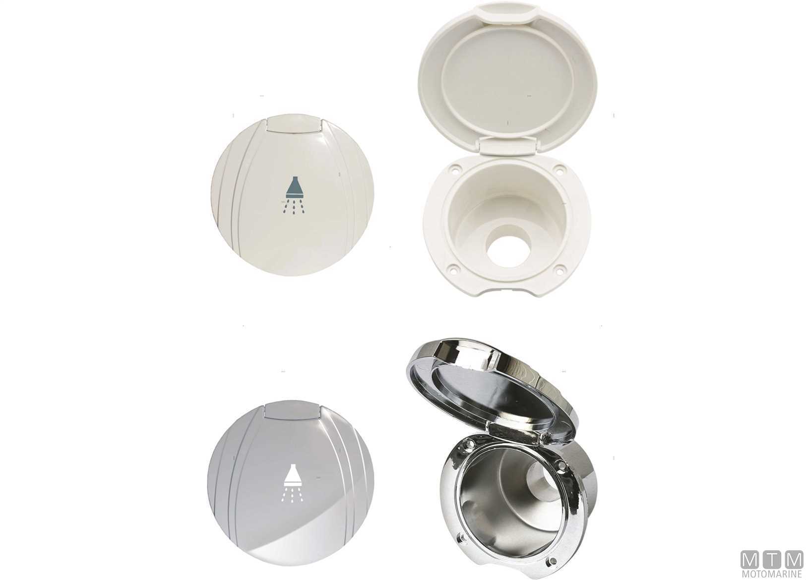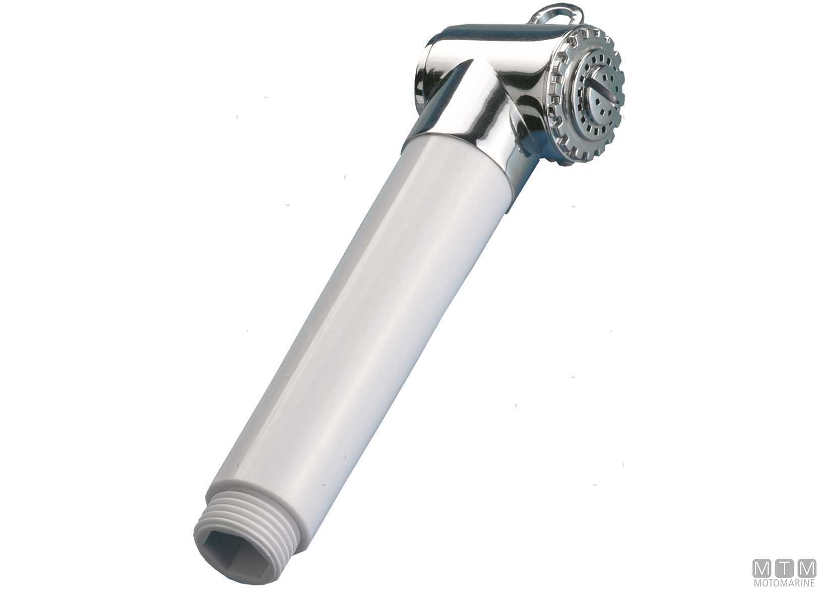 Testa doccetta Knob Lisa in Ottone Cromato e ABS. Anello d'aggancio e bottone comando apri/chiudi. Attacco da 1/2".