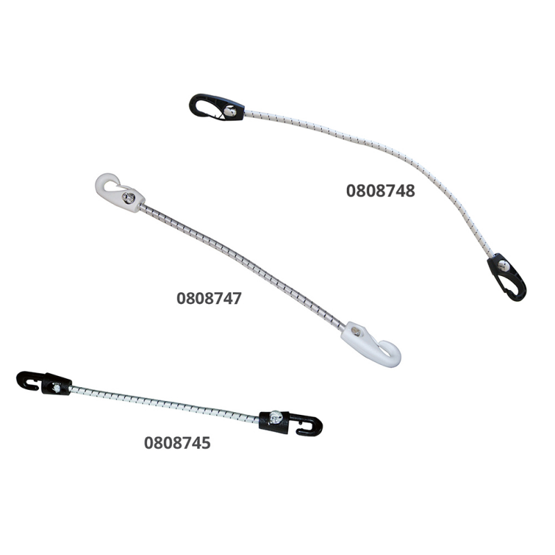 Treccia elastica con doppio moschettone in nylon nero adatta per tutti gli usi.. Conf. 20 pz.