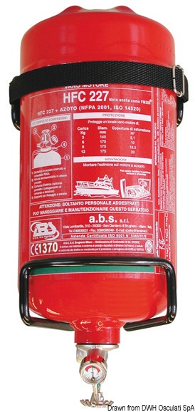 Omologati RINA, CE automatici a gas estinguente ecologico. Questo prodotto sostituisce l’Halon 1301 ed agisce a saturazione di ambiente. Rispetto alla polvere estinguente, non lascia alcun residuo per cui, anche in caso di apertura accidentale, non occorre ripristinare tutta la meccanica e accessoristica intasata dalla polvere estinguente. Il kit é composto da: bombola caricata a gas HFC-227 o FK-5-1-12 (ex NOVEC) + valvola speciale SPRINTVALVE ad attivazione termica a 93°+ cavetto con maniglia per comando a distanza, lunghezza 6 m accorciabile + staffa fissaggio estintore. Agendo per saturazione questo impianto non richiede tubazioni e ugelli supplementari. Per cubature maggiori, si possono usare più estintori.