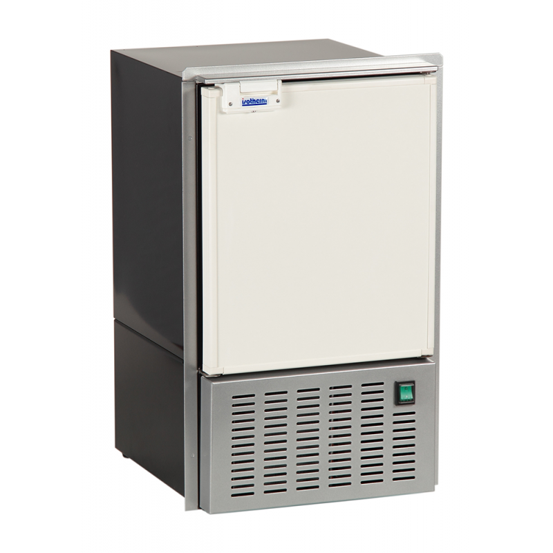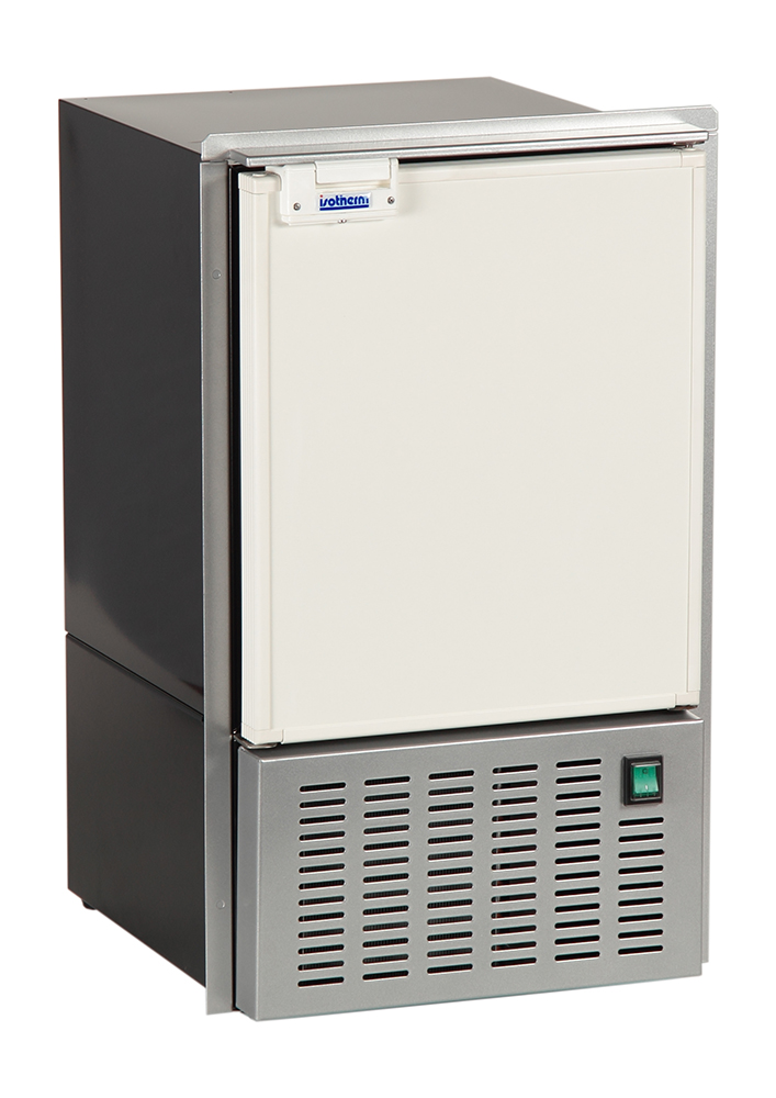 Produttore automatico di ghiaccio bianco a mezza luna con ventilazione frontale. Necessita di allaccio all’impianto idrico di bordo.