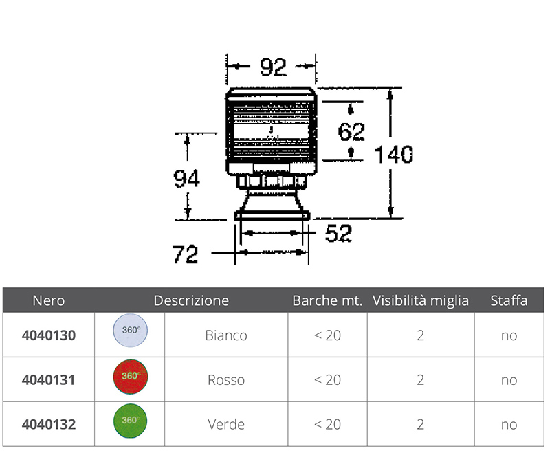 Fanali in policarbonato nero rinforzato, staffa a parete in acciaio inox completi di attestato di omologazione. Forniti senza lampadina,lente Fresnel in policarbonato resistente agli urti. Visibilita' 2 miglia, per barche inferiori a mt. 20