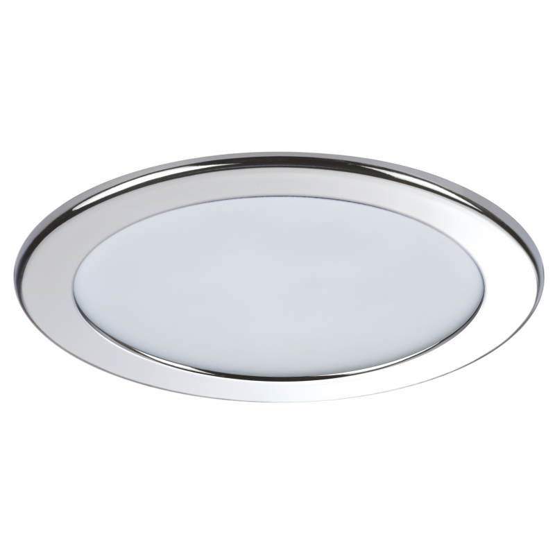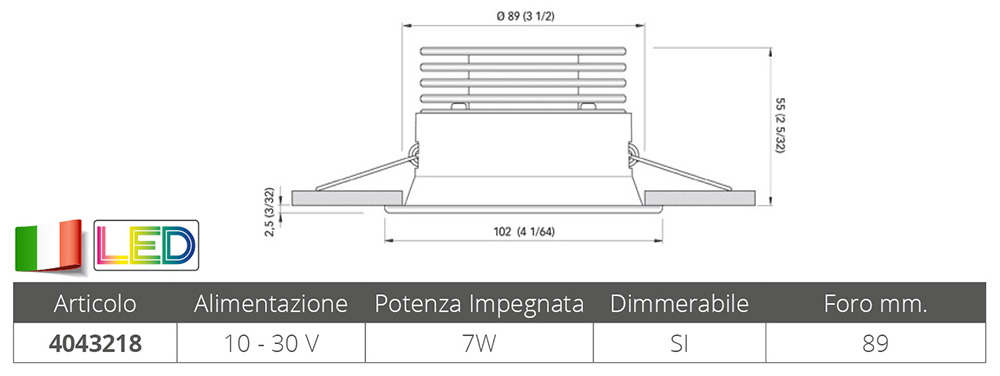 Faretto stagno IP40 in acciaio inox AISI 316 lucido ad alta luminosità ( 367 Lumen ), luce bianca calda, dimmerabile,sensibile alla polarità. Alim. 10-30v, dim. Ø mm. 102, foro Ø.mm. 89, profondità mm.55