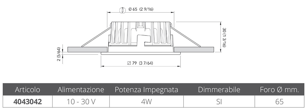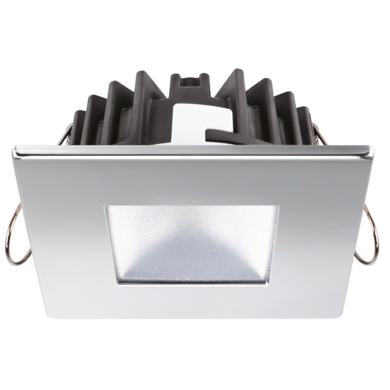 Faretto stagno IP66 a 2 POWER LED (215 Lumen) ad alta luminosità, luce bianca calda con cornice quadrata in acciaio inox AISI 316, dimmerabile,sensibile alla polarità. Alim. 10-30v, dim. mm. 79 x 79, foro Ø mm. 65, profondità mm.30