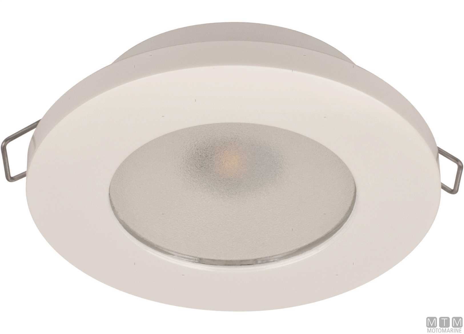 Faretto LED 2W IP40 per interni con cornice in composito bianco. Montaggio ad incasso con molle. Voltaggio universale 9-32V con LED dimmerabile protetto da picchi e inversione.