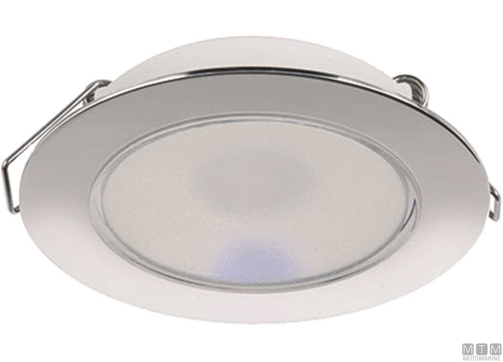 Faretto LED 2W IP65 per interni ed esterni con cornice piatta in Acciaio Inox AISI316, interruttore touch e regolatore di intensità. Montaggio ad incasso con molle. Voltaggio universale 9-32V con LED protetto da picchi e inversione.