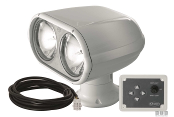 Faro doppio orientabile con pannello di controllo cablato impermeabile. Corpo stagno con 2 bulbi alogeni stagni da 55W. 2 fasci di luce: 1°) diffuso 2°) profondo. Dimensioni: L220 x Largh.257 x H210 mm. Comando wireless opzionale con ricevitore e trasmettitore plug and play fino a 35 m. Se installato, sostituisce il pannello controllo cablato. Per mantenere entrambi, è necessario acquistare il pannello doppia stazione.