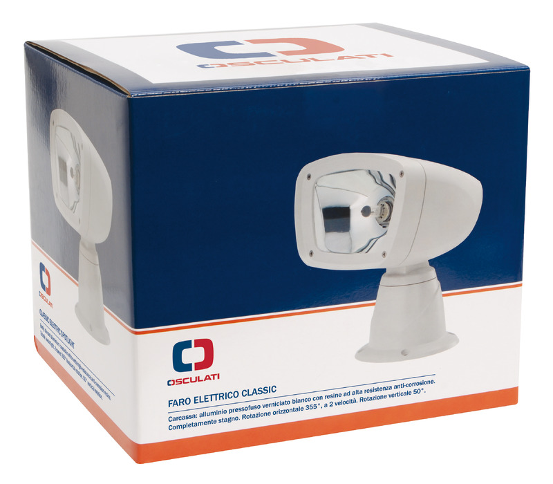 Carcassa: alluminio pressofuso e verniciato bianco con resine ad alta resistenza anti-corrosione. Completamente stagni. Rotazione orizzontale 355°, a 2 velocità. Rotazione verticale 50°. Versione A: con lampadina alogena doppio filamento (spot + flood) da 100 W + 90 W. Versione B: HID con lampadina a scarica di gas XENO ultrapotente (35W HID).