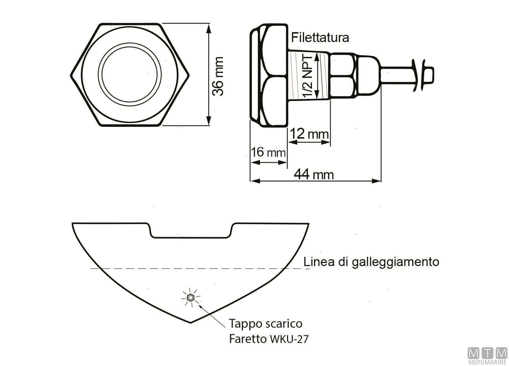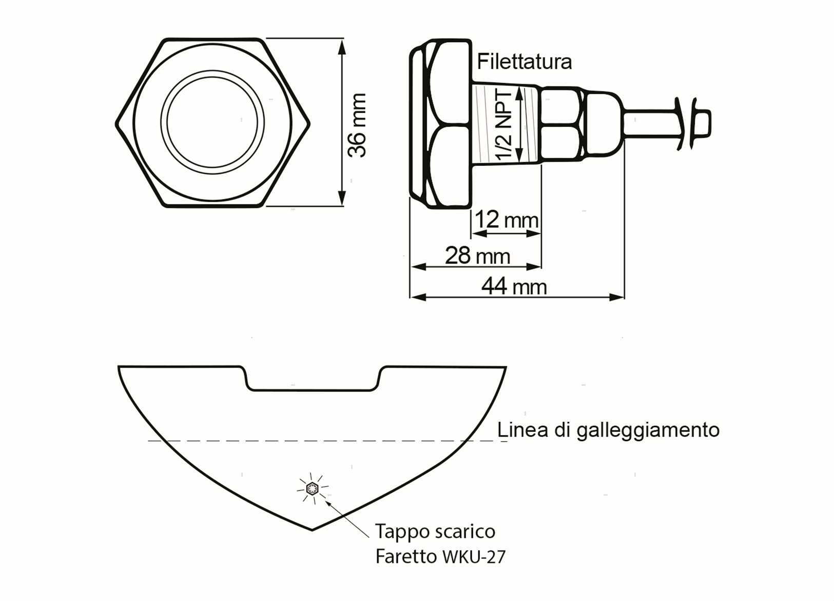 Faro subacqueo LED con Power-CREE LED di grande luminosità.↵ Grazie alla filettatura NPT da 1/2" si monta facilmente su ombrinali e tappi di scarico a poppa sotto la linea di galleggiamento. Corpo in Acciaio Inox 316 stagno IP68 con elettronica immersa in gel siliconico protettivo. Con scheda driver integrata e circuito di protezione termica. Voltaggio universale 9-32V.