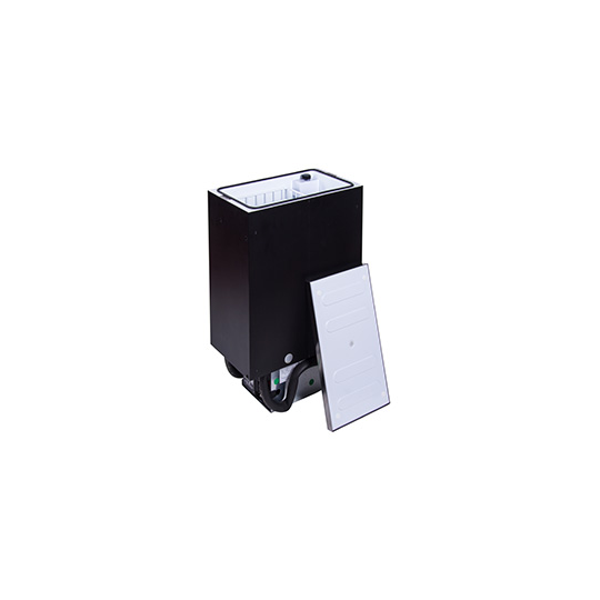 Rivestimento interno in acciaio inox e fondo in plastica. Può essere dotato di guide scorrevoli. Compressore ventilato installato nella parte inferiore del lato corto, che può essere spostato fino ad una distanza di mt. 1,5. Prof. motore mm. 165. Dim. mm. 450(+165) h x 340 lar. x 496 lung.