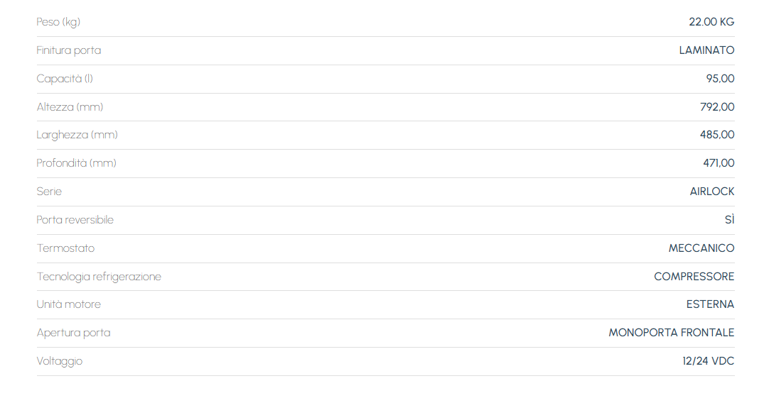 Vitrifrigo Il frigo-freezer C95L della serie Airlock rappresenta una soluzione ottimale, in quanto dotato di una capacità totale di 95 litri, di cui 12,8 destinati al compartimento freezer se scelto come optional. L'unità refrigerante è posizionata esternamente. Tra le sue caratteristiche principali, troviamo la porta pannellabile nera con chiusura a scatto, progettata per prevenire aperture accidentali. Inoltre, la porta presenta un innovativo sistema "vent position" integrato nella maniglia, il quale consente una parziale apertura durante i periodi di inutilizzo. Questa funzione non solo previene la formazione di muffe e odori indesiderati ma contribuisce anche a garantire una migliore conservazione dei tuoi alimenti.