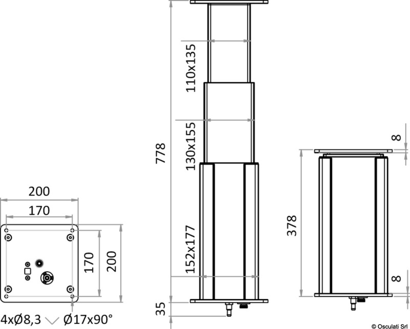 Gamba tavolo elettrica a tre stadi in alluminio anodizzato argento o nero, adatta sia all'esterno sia all'interno barca.