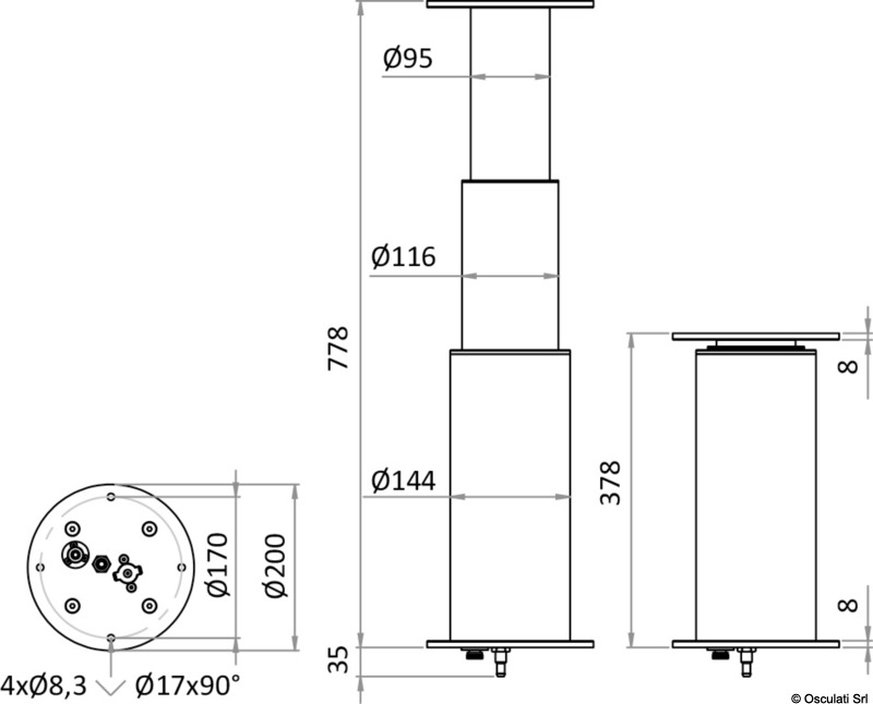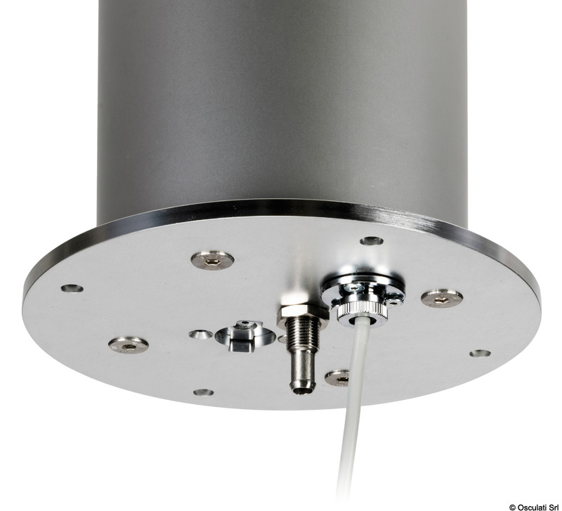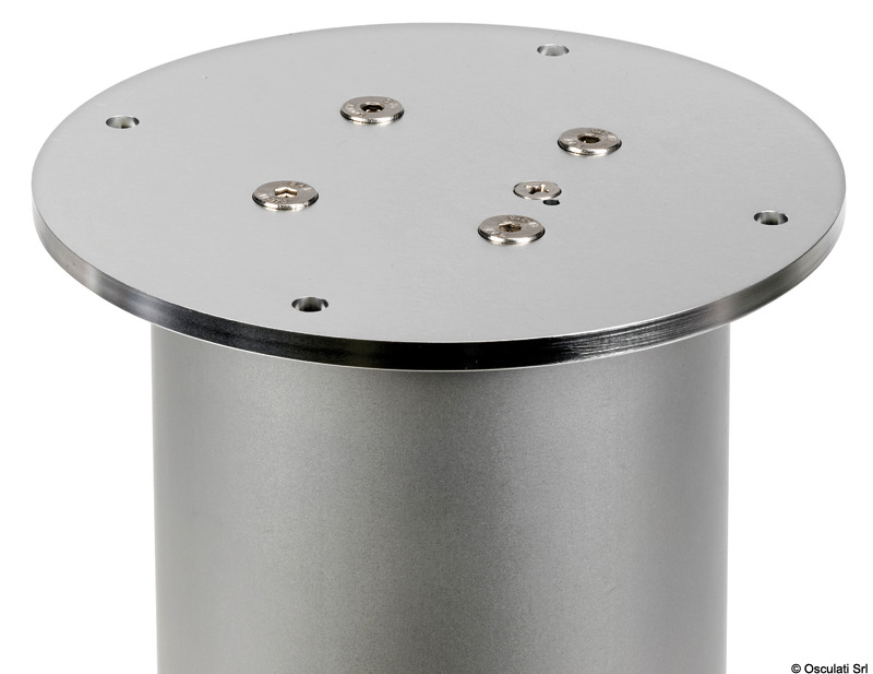 Gamba tavolo elettrica rotonda a tre stadi in alluminio anodizzato argento, adatta sia all'esterno sia all'interno barca, con antirotazione.