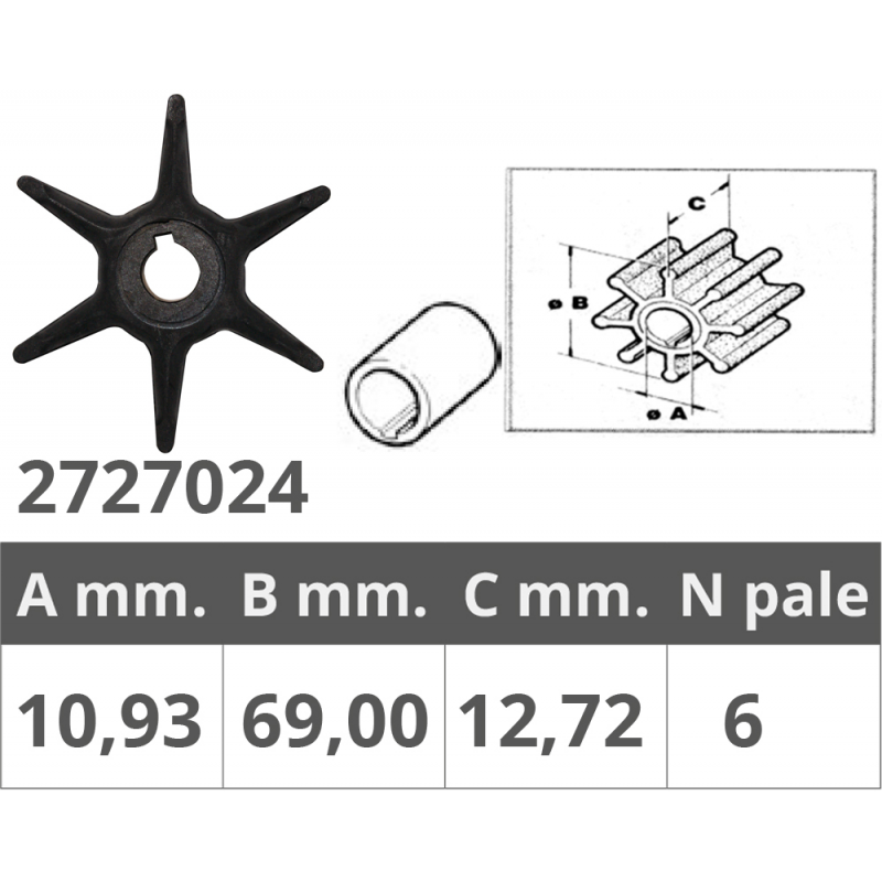 Rif. or.277181/434424 per motori 2T 3-4-5-5,5-6-7,5 HP, dim. Ø int.mm.11 Ø est.mm.69 spessore mm.12,8 , nr.6 pale