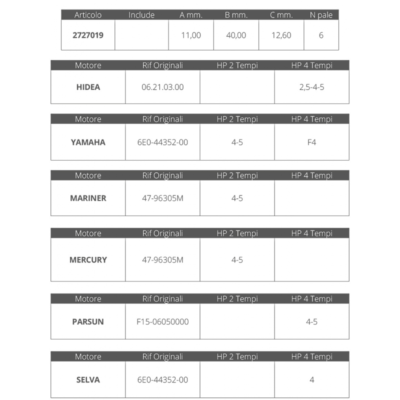 Rif.or.YAMAHA/SELVA 6E0-44352-00, per motori 2T 4-5 HP e 4T 4 hp rif.or.MARINER 47-96305M, per motori 2T 4 HP dim. Ø int.mm.11 Ø est.mm.40 spessore mm.12,6, nr.6 pale
