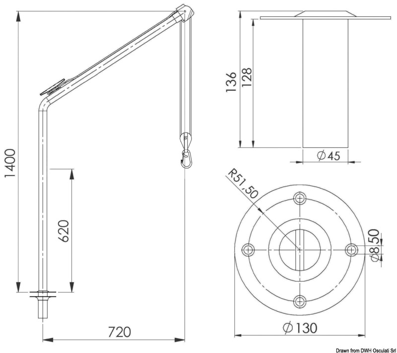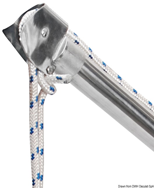 Adatta per sollevamento tender (in coppia)o per sollevamento motore fuoribordo. Completa di boccola in acciaio inox ad incasso, carrucola di rinvio e cima in nylon.