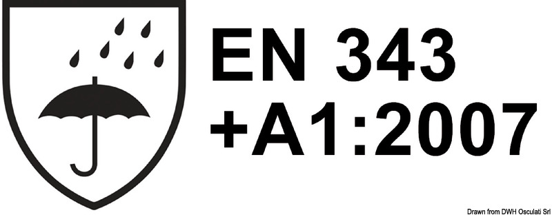 Giacca: Cerniera frontale YKK® con doppia protezione, tasca napoleone con zip e foro per cuffie, cappuccio regolabile frontalmente con cordino e ripiegabile, polsini in neoprene, tasca interna, EN 343:2003 + A1:2007 3,1 , AATCC 127 .