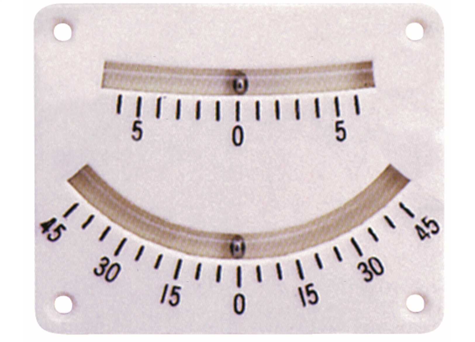 Inclinometro con scala da 45°-0°-45°. Scala amplificata: 5°-0°-5°.