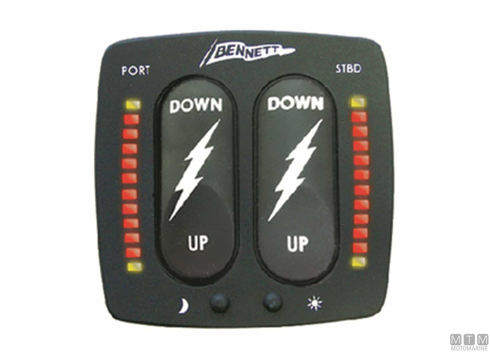 Indicatore di assetto OBI Bennett 12/24V con pulsanti Rocker, indicatori LED, dimmer di luminosità e centralina Auto Tab Retractor (ATR) integrata nel pannello. Comprende due teste pistone con sensori e cavi per il collegamento. Può essere installato su qualsiasi scafo con flaps Bennett, l'ATR fa rientrare automaticamente i flaps quando si disinserisce la chiave di accensione.