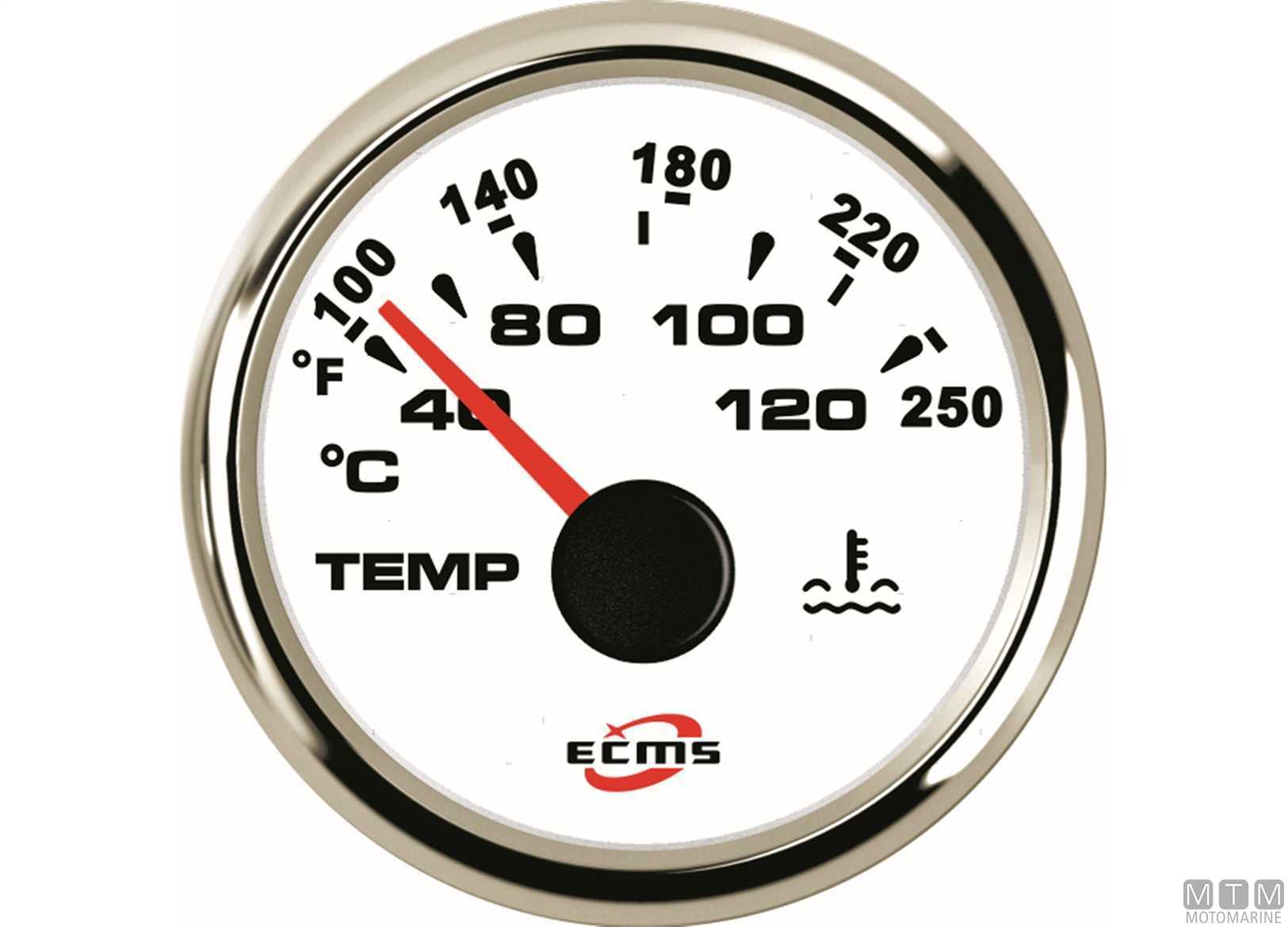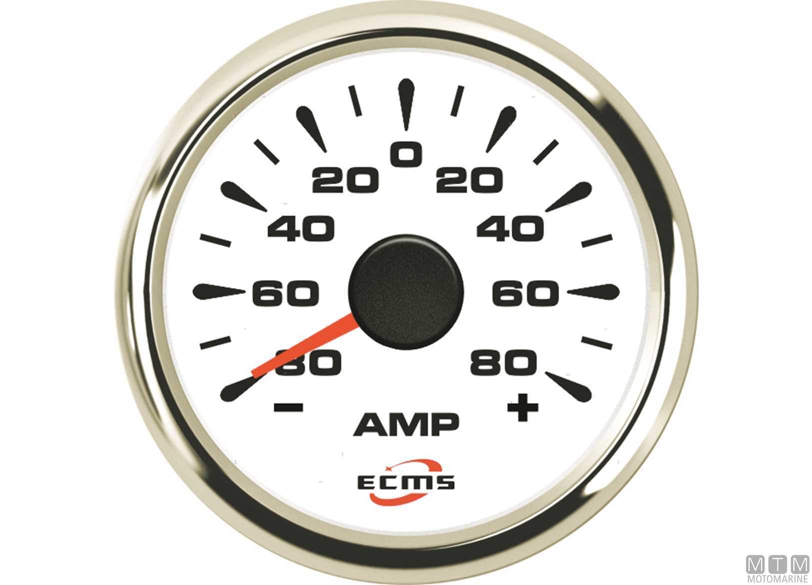 Strumentazione Ecms White Chrome 9-32V completa di cavetti con connettore Molex, cornice in Acciaio Inox 316 con finitura cromata e frontalino impermeabile IP67 con lente bombata anti-appannamento. Quadrante retroilluminato con luce LED personalizzabile in vari colori. ↵Gli indicatori di livello si possono impostare su qualsiasi valore di impedenza tramite il tasto posteriore di configurazione. Sono pre-impostati sul valore standard 0-190 Ohm. ↵Gli indicatori pressione olio da 5 e 10 bar sono compatibili con sensori standard (10-180 Ohm), mentre il 30 bar è compatibile solo con sensori elettronici (0,5-4,5V). ↵Gli amperometri sono completi di sensore (shunt) per misurare la corrente.