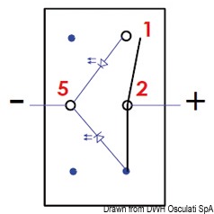 Impermeabili IP56 serie Marina, richiedono per l’installazione un foro rettangolare da 21,5x36,8 mm. Capacità massima 20 A a 12 V e 12 A a 24 V. Completi di doppio LED di colore rosso: uno che illumina il simbolo dell’utenza, sempre acceso, il secondo che illumina una apposita fessura sotto il simbolo che si accende quando si attiva l’utenza. Bascula da ordinare a parte.