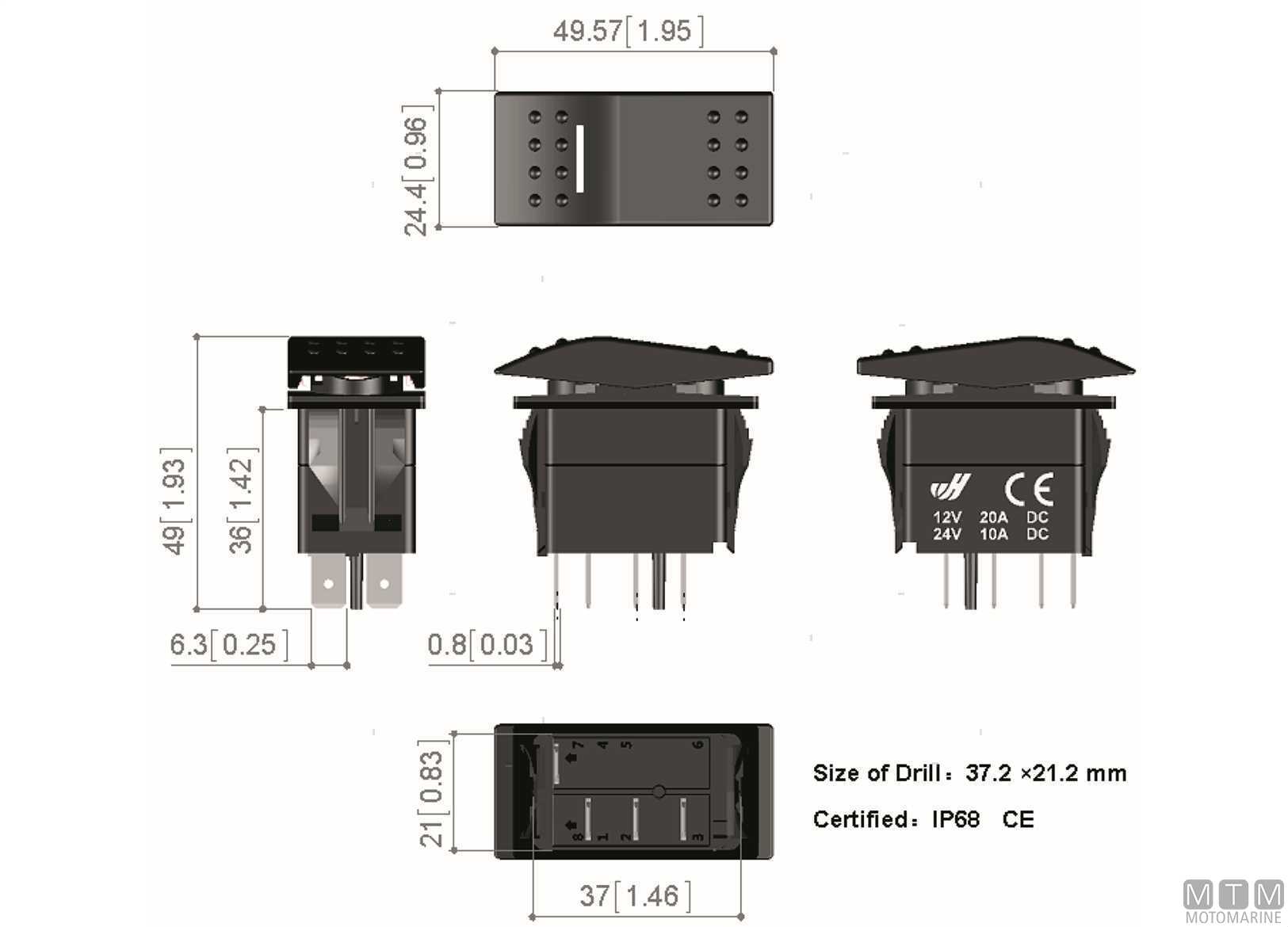 Interruttori basculanti 12/24V (20/10A) impermeabili IP68 con guarnizione in Nitrile.Con luce LED bianca che si illumina quando l'interruttore viene azionato.↵On tra parentesi (On) indica una posizione momentanea.