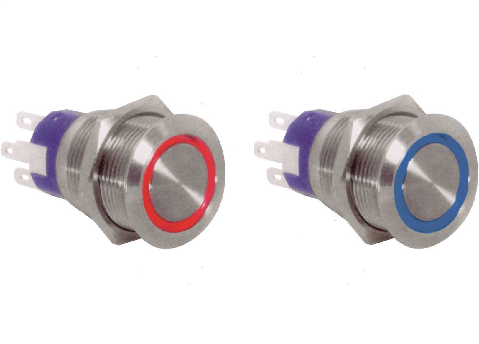 Interruttore a pulsante 12/24V impermeabile IP67 con luce LED e corpo in Acciaio Inox. Montaggio a filo con foro da 19 mm. Altezza incasso 38 mm.