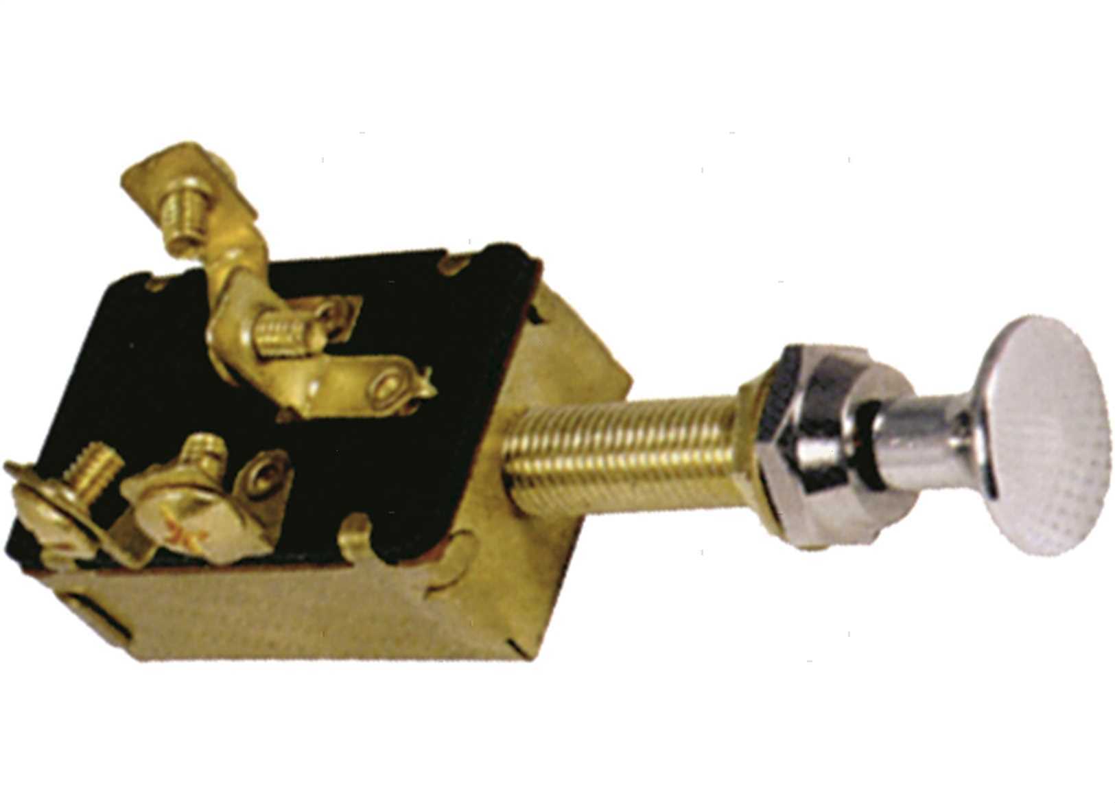 Interruttore con corpo in Ottone e pulsante a tiretto in Ottone Cromato. Per 2 circuiti. Foro da 9 mm.