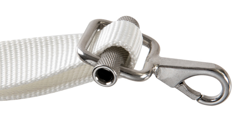 Un'estremità con moschettone e cinghia per regolazione fissa e una con moschettone di tensionamento.