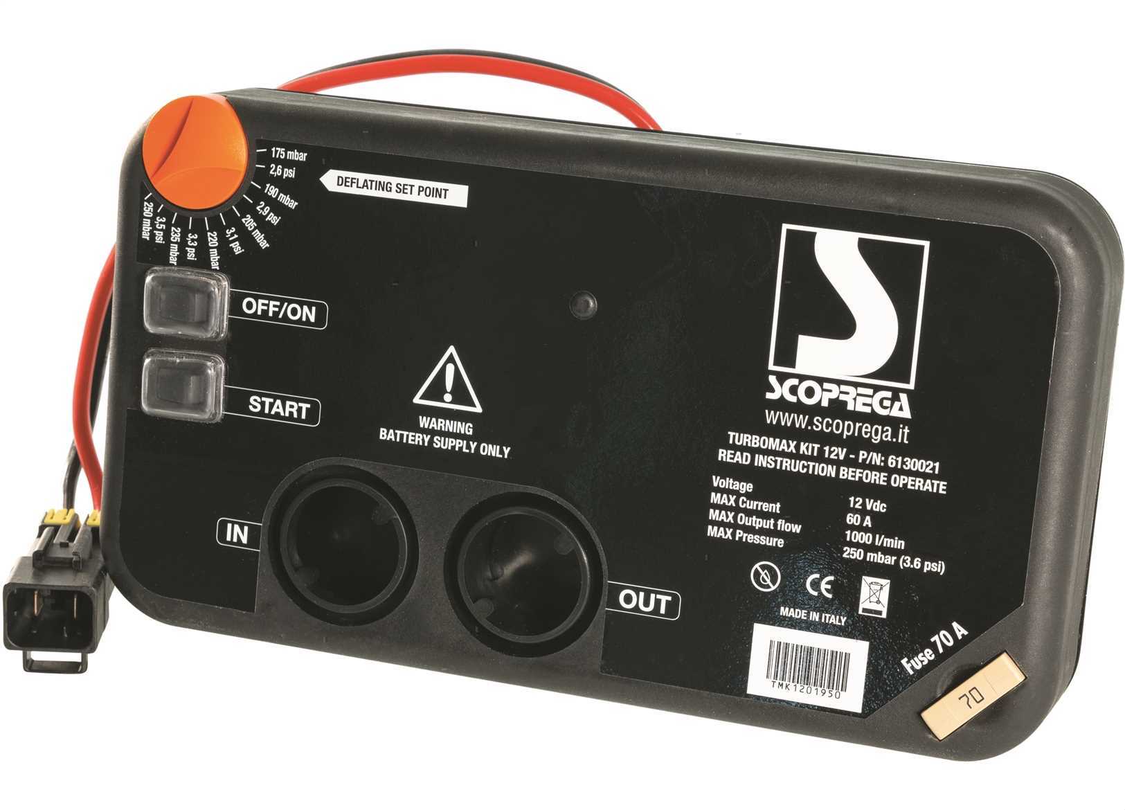 Gonfiatore a installazione fissa Turbo Max Kit con arresto automatico alla pressione impostata. Può gonfiare e sgonfiare un battello pneumatico da 7 metri in 7 minuti.Completo di staffe per il fissaggio, viti e cavo alimentazione da 0,5 metri.Dispone di un driver digitale con tecnologie DSP e MOSFET, controllo a LED integrato e offre versioni sia a 12V che a 24V su richiesta. Dimensioni: 30 x 16 x 7 cm, consumo massimo 60A.