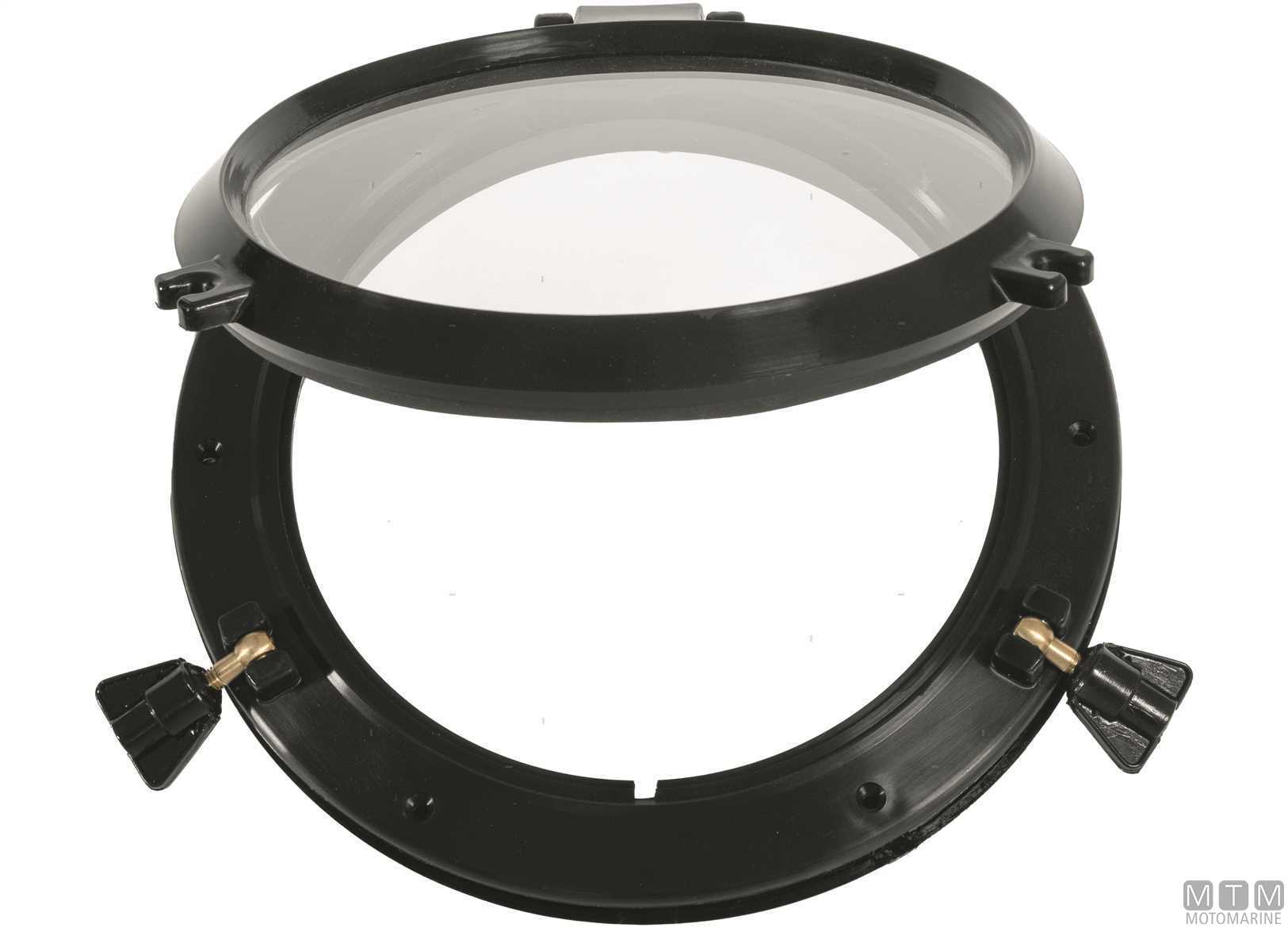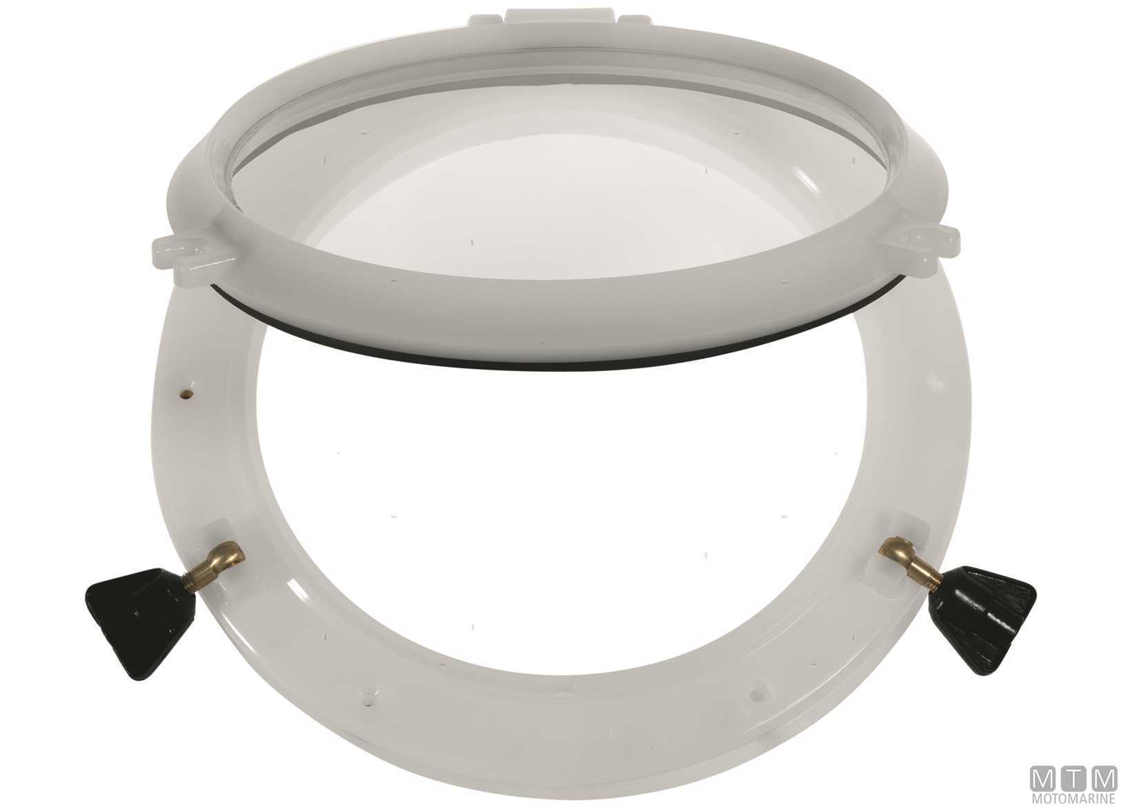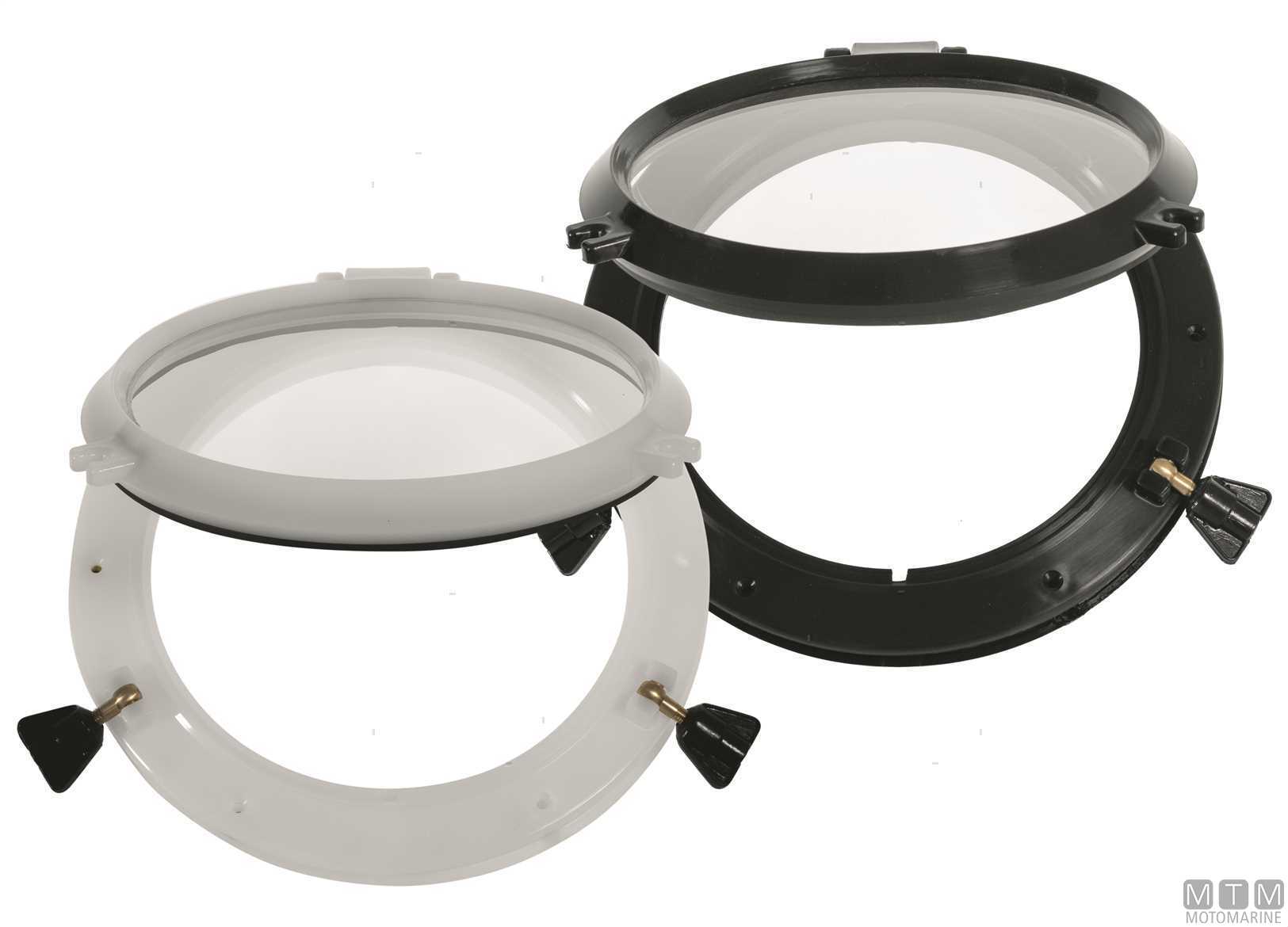 Oblò tondi MTM con cornice in Nylon puro e vetro in Acrilico. Completi di controcornice. Viti non incluse. H Collo 30 mm. Certificati CE EN ISO12216.