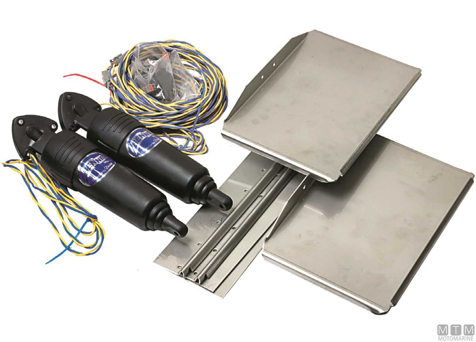 Kit Trim elettromeccanico Bennett 12V per imbarcazioni da 5.8 a 7.3 metri. ↵Comprende due pistoni e due pale in Acciaio Inox. ↵Il pannello comando va ordinato a parte: ↵ Pannello 4723535: comando standard up-down. ↵Pannello 4723539: comando OBI9000E up-down con Auto Tab Retractor ATR (rientro automatico dei flaps quando disattivati) e indicatore di assetto LED con dimmer di luminosità giorno/notte. Comprende anche due teste pistone con sensori.