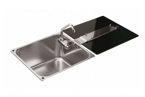 Lavello quadro in Acciaio Inossidabile 18/8 con coperchio in vetro temperato. Completo di rubinetto pieghevole acqua fredda, da completare con piletta ø 50 mm.