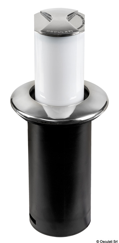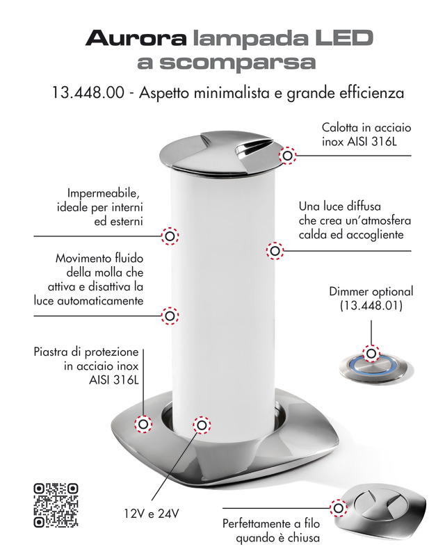 Da spenta la luce rimane a filo piano del tavolo e con una leggera rotazione del piattello inox superiore si alza accendendosi automaticamente. Dimmerabile con apposito optional (13.448.01) per abbassare la luce con effetto "ambientazione". Parte superiore in acciaio inox AISI 316 lucidato a specchio.