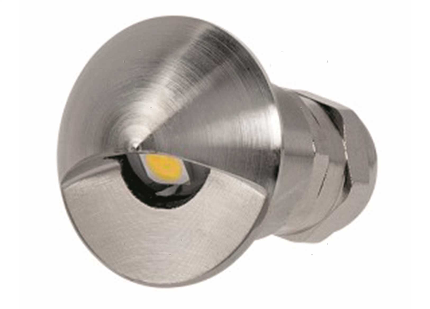 Luce di cortesia LED 12V in Acciaio Inox con montaggio a incasso.↵Robusta e impermeabile IP67, ideale per battute e gradini.↵Consumo ridotto 0,8W. Luce bianca fredda 6000 K°.↵Completa di cablaggio stagno con fusibile.