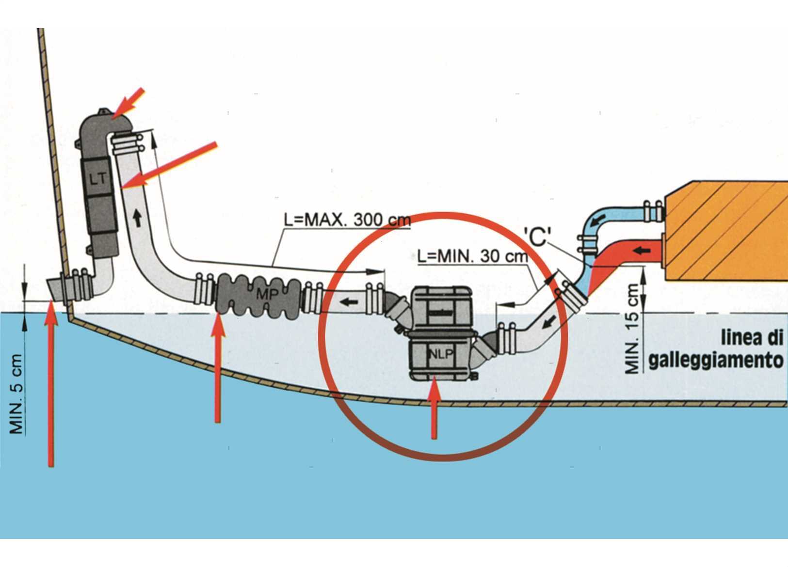 Marmitta silenziatore in materiale plastico rinforzato con raccordi girevoli. Compatta, può essere montata in luoghi angusti. Si installa su sistemi di scarico raffreddati ad acqua. Capacità:↵Marmitte H 254 mm = 4,5 Lt.↵Marmitte H 362 mm = 10 Lt.