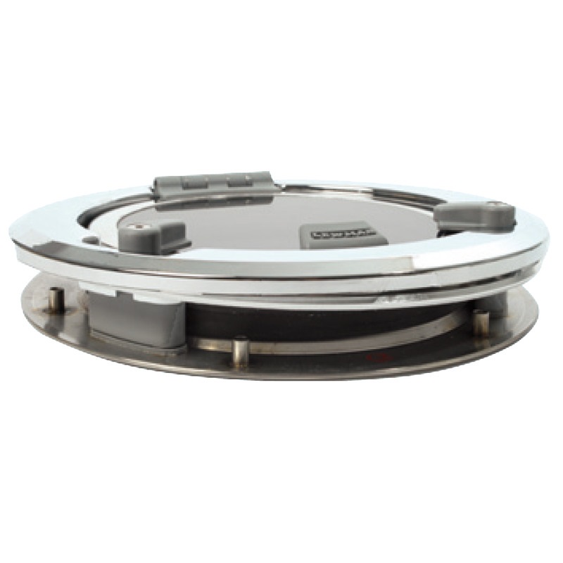 Fornito completo di controflangia di finitura in ABS cromato e viti di montaggio, vetro fumé. Installazione mediante una ghiera con fori filettati che rende l'operazione facilmente e velocemente realizzabile da una sola persona. Apertura a 180°. Approvato CE categoria B Area 1.