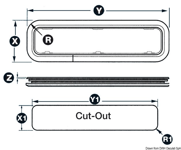 | 19.430.18 | Oblò Lewmar New Standard 1RE Ellittico | 1,3 | 1RE | 191 | 367 | 4 | 95 | 8 | 171 | 347 | 85,5 |