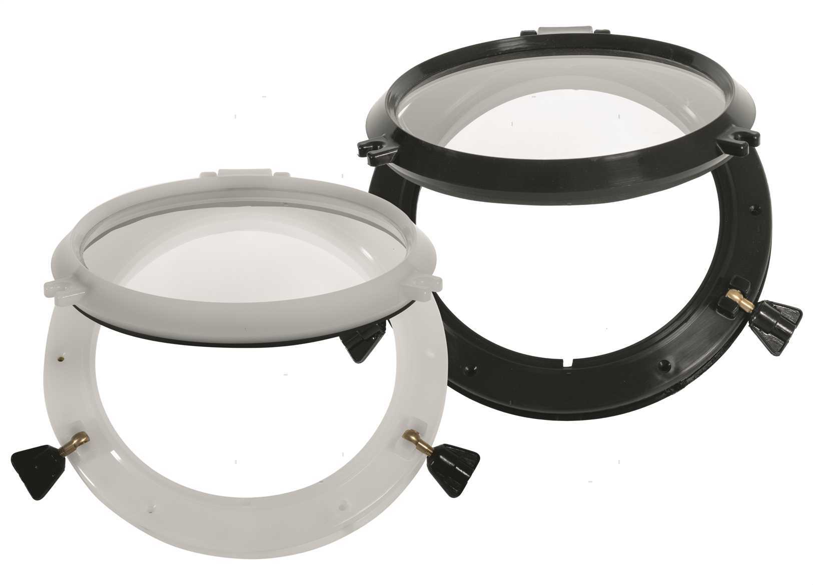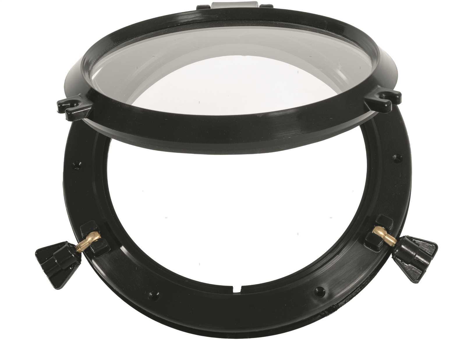 Oblò tondi MTM con cornice in Nylon puro e vetro in Acrilico. Completi di controcornice. Viti non incluse. H Collo 30 mm. Certificati CE EN ISO12216.