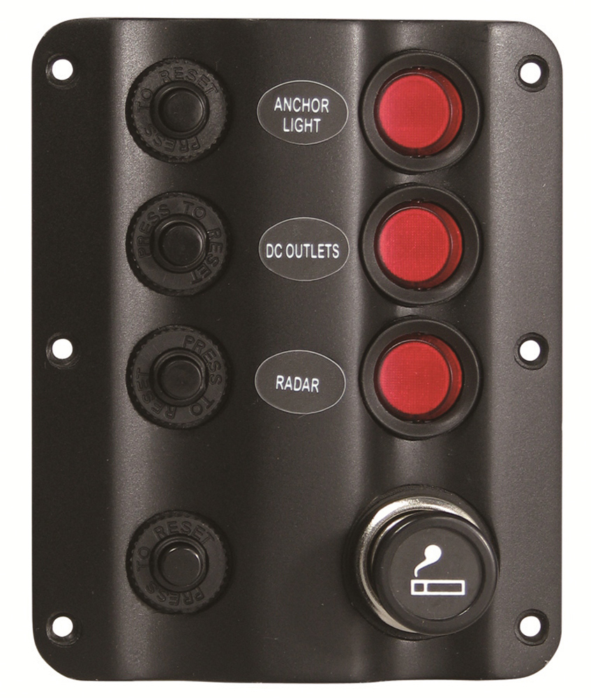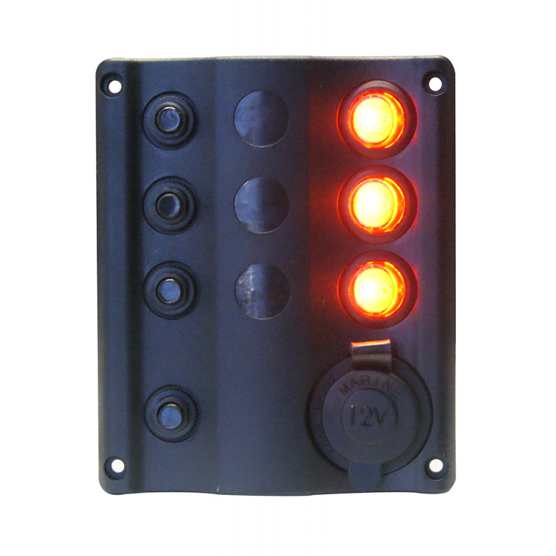 Pannello elettrico in plastica nera con interruttori basculanti,LED, fusibili e presa accendisigari