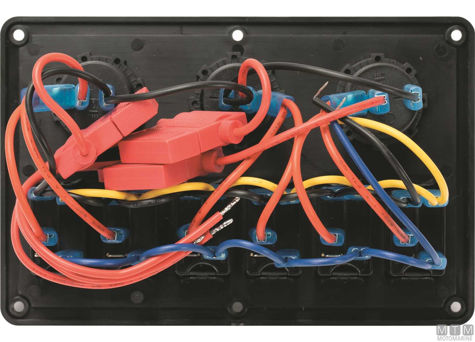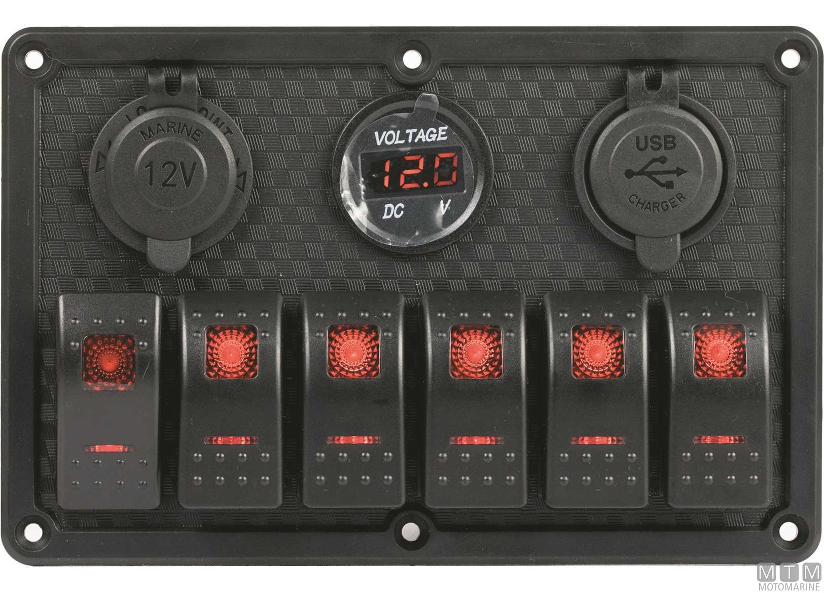 Pannello in Polimero con interruttori basculanti impermeabili a LED rossi. Il primo interruttore è (ON)-OFF per segnalazione acustica. Con voltmetro 6-30V, presa 12V e doppia presa USB 1+2.1A, tutte complete di fusibile. Precablato, completo con viti ed etichette prestampate.