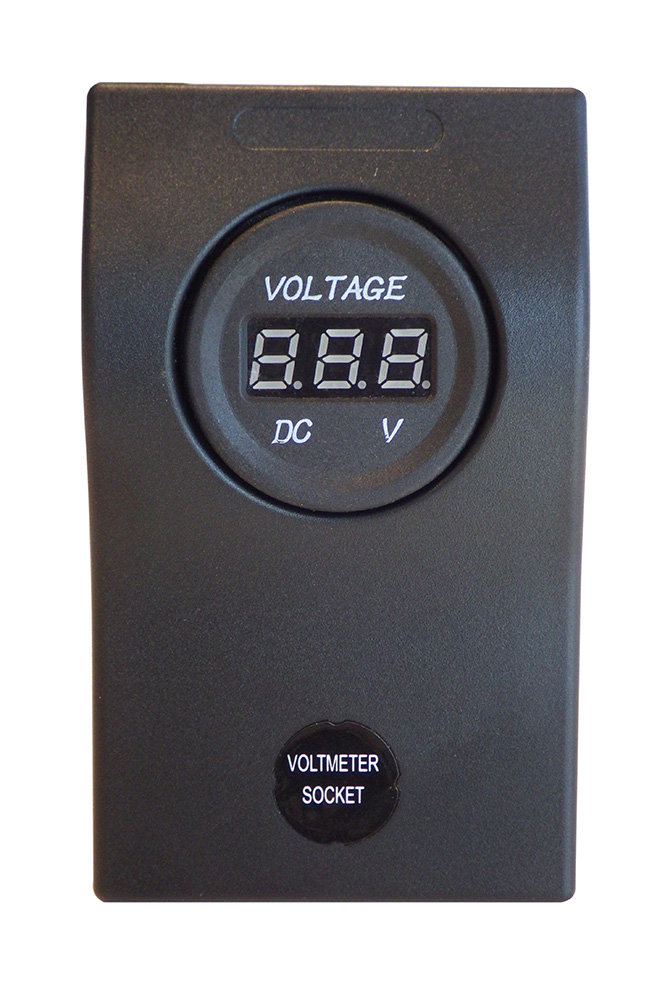 Pannello in plastica con Voltmetro digitale a 3 cifre di facile lettura per verifica stato tensione batteria o gruppo batterie a 12/24vdc. Magnetotermico di protezione. Fissaggio con 4 viti frontali nascoste da una placca di rifinitura.Dim.mm.60X100